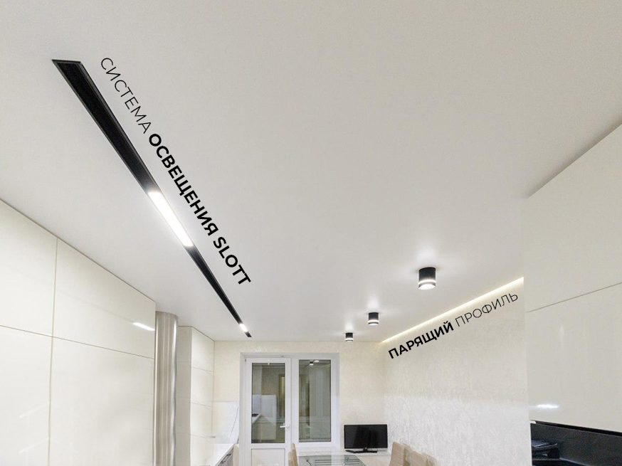При выключенном свете поверхность будет белой матовой, к которой привык наш глаз, а стоит щелкнуть выключателем, как на потолке проступят линии света. Их конфигурация может быть любой. Вместе с мастером вы выбираете их расположение, яркость ламп, их температуру.